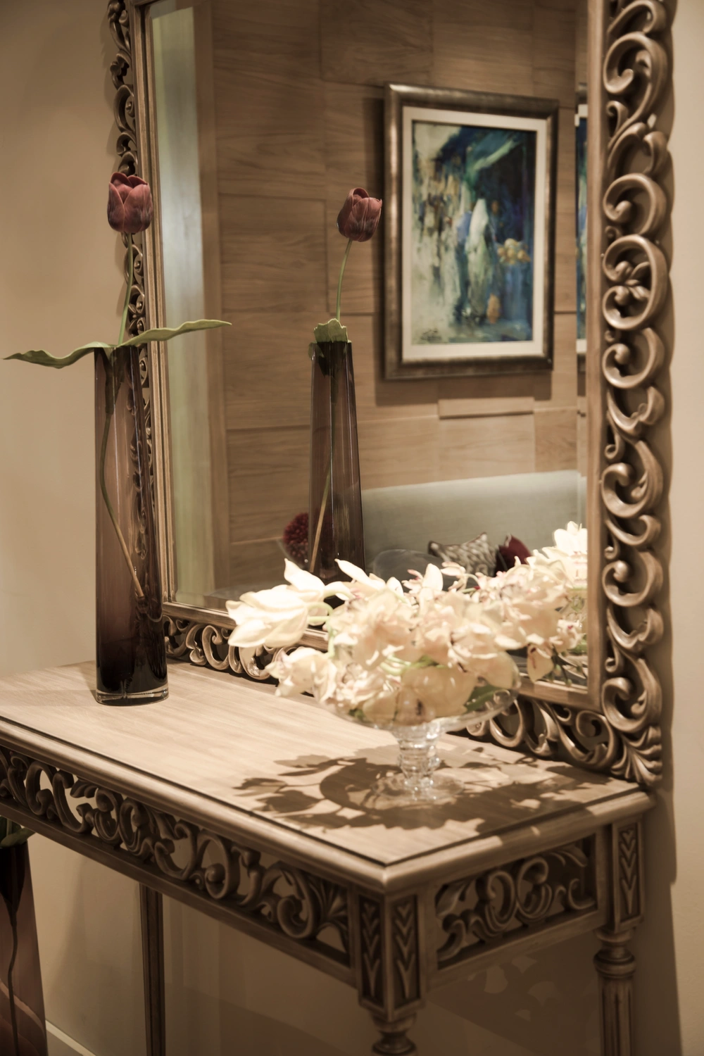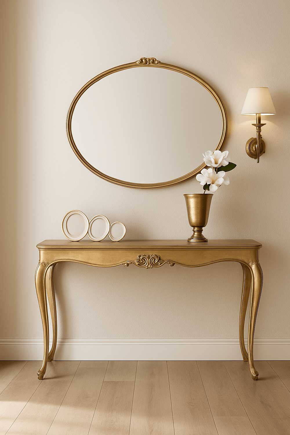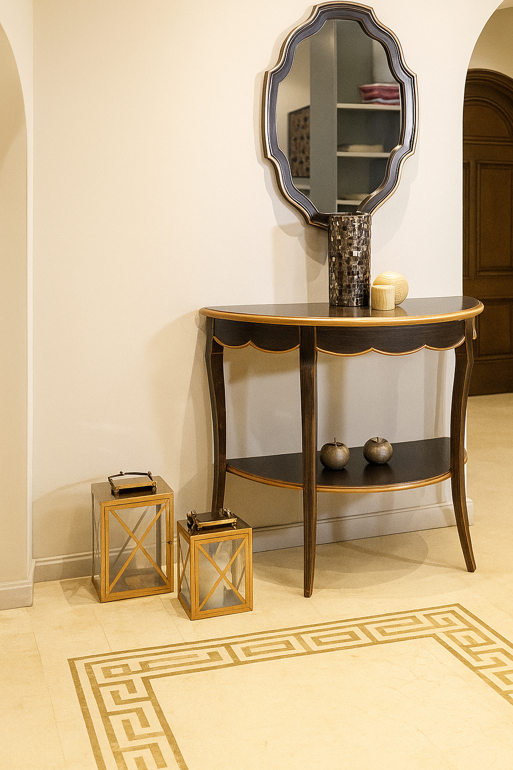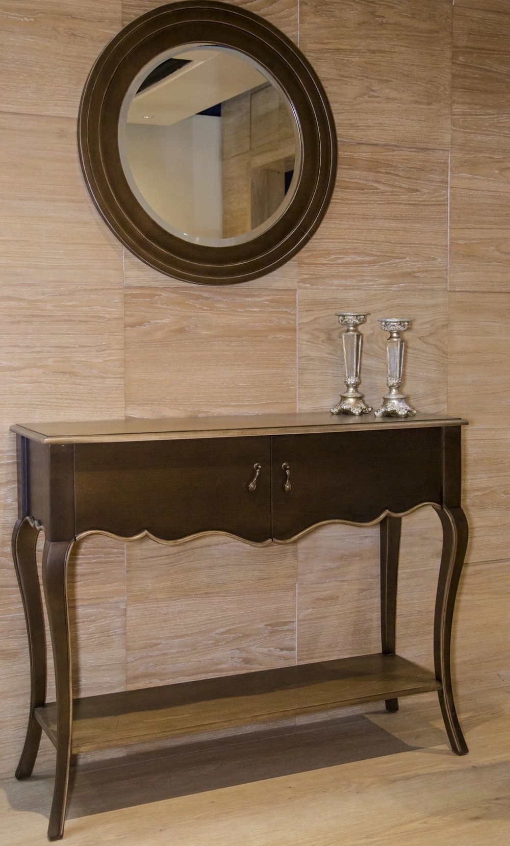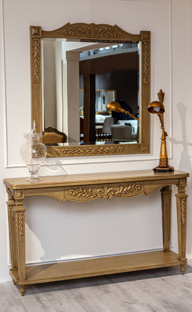 La console AFENDI rappelle l’art et le faste des intérieurs classiques. Réalisée en hêtre massif, elle se distingue par ses ornements sculptés à la main…