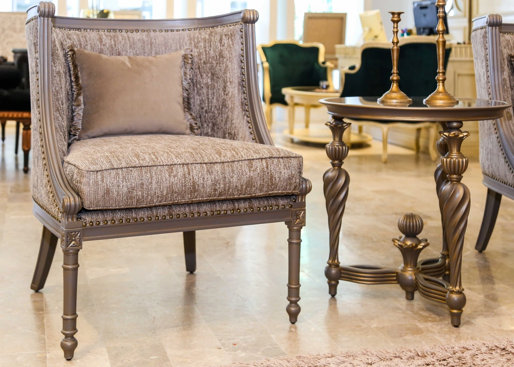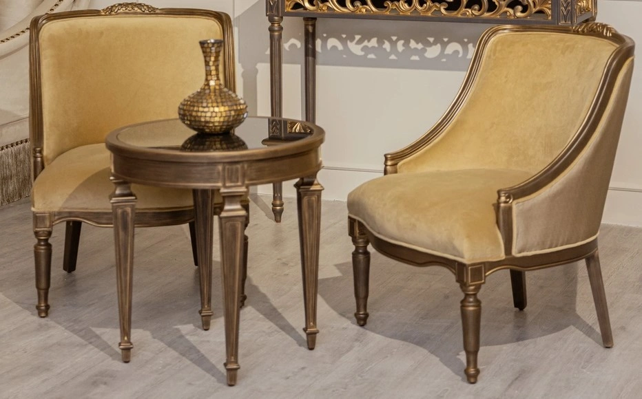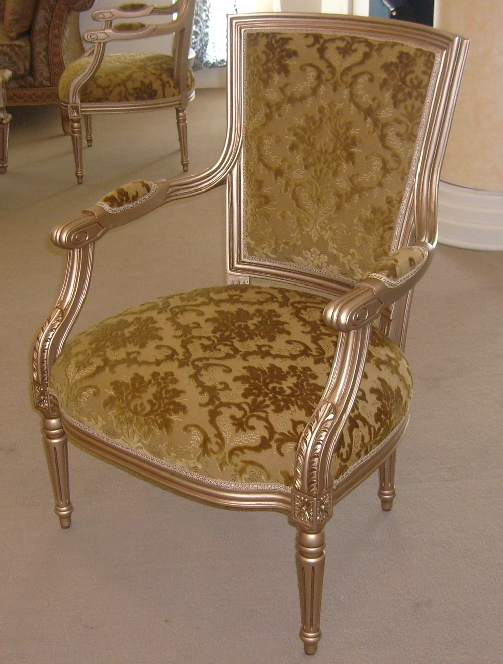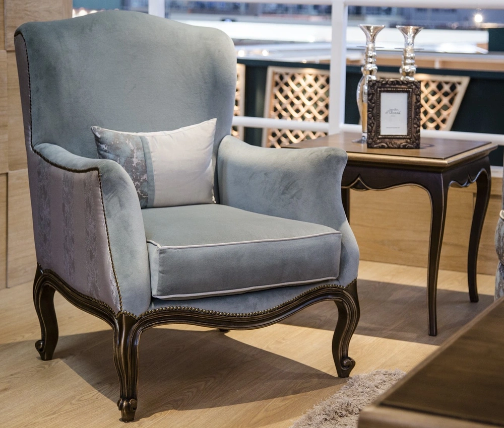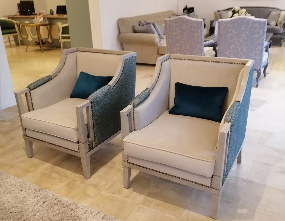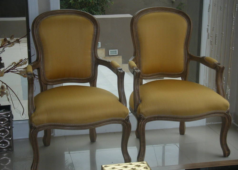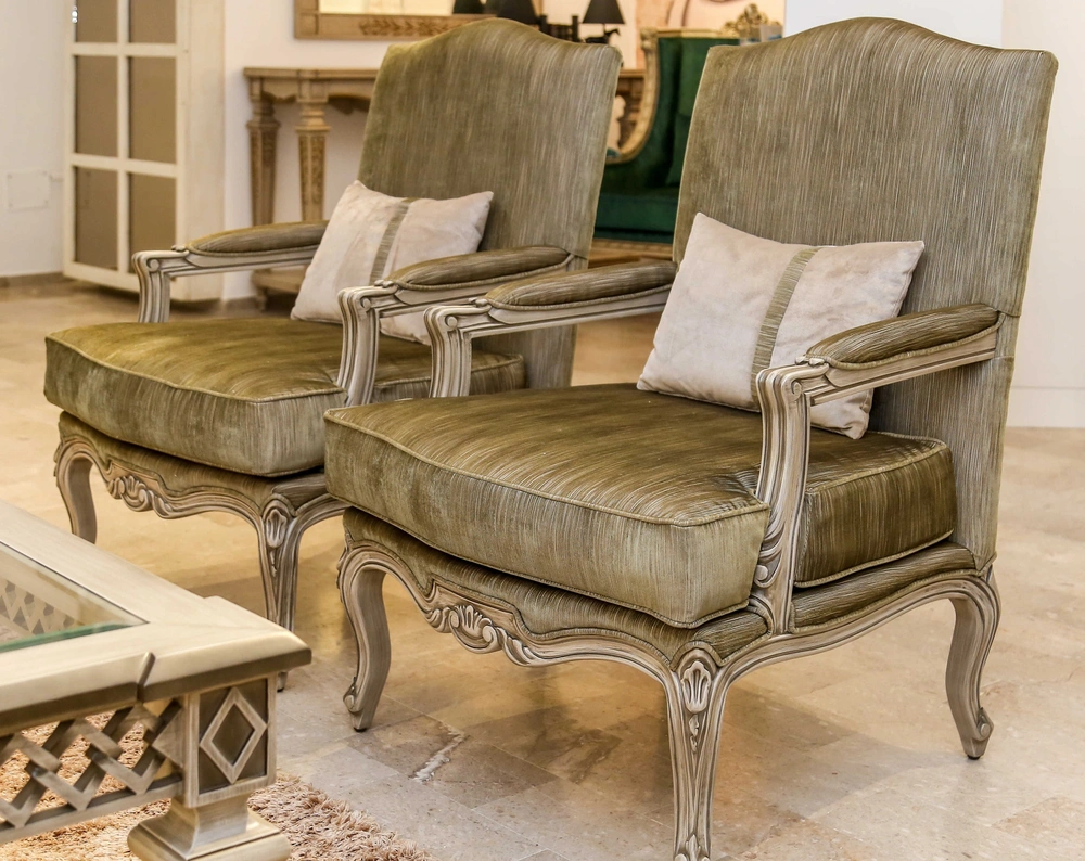 Fauteuils présentent une structure en bois avec des lignes courbes et un style classique évoquant le mobilier ancien. L’assise et le dossier sont recouverts d’un tissu uni,…