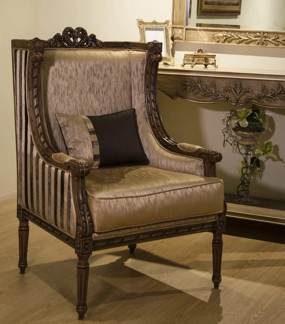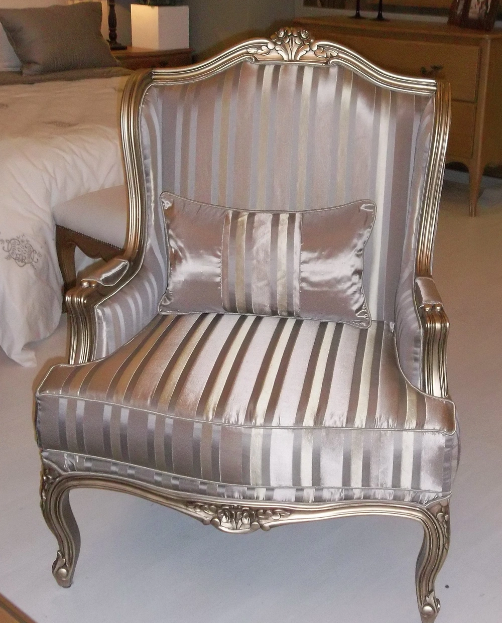 Fauteuil raffiné présente une structure en bois finement sculptée, mettant en valeur son design classique. Il est recouvert d’un tissu texturé, avec un motif subtil…