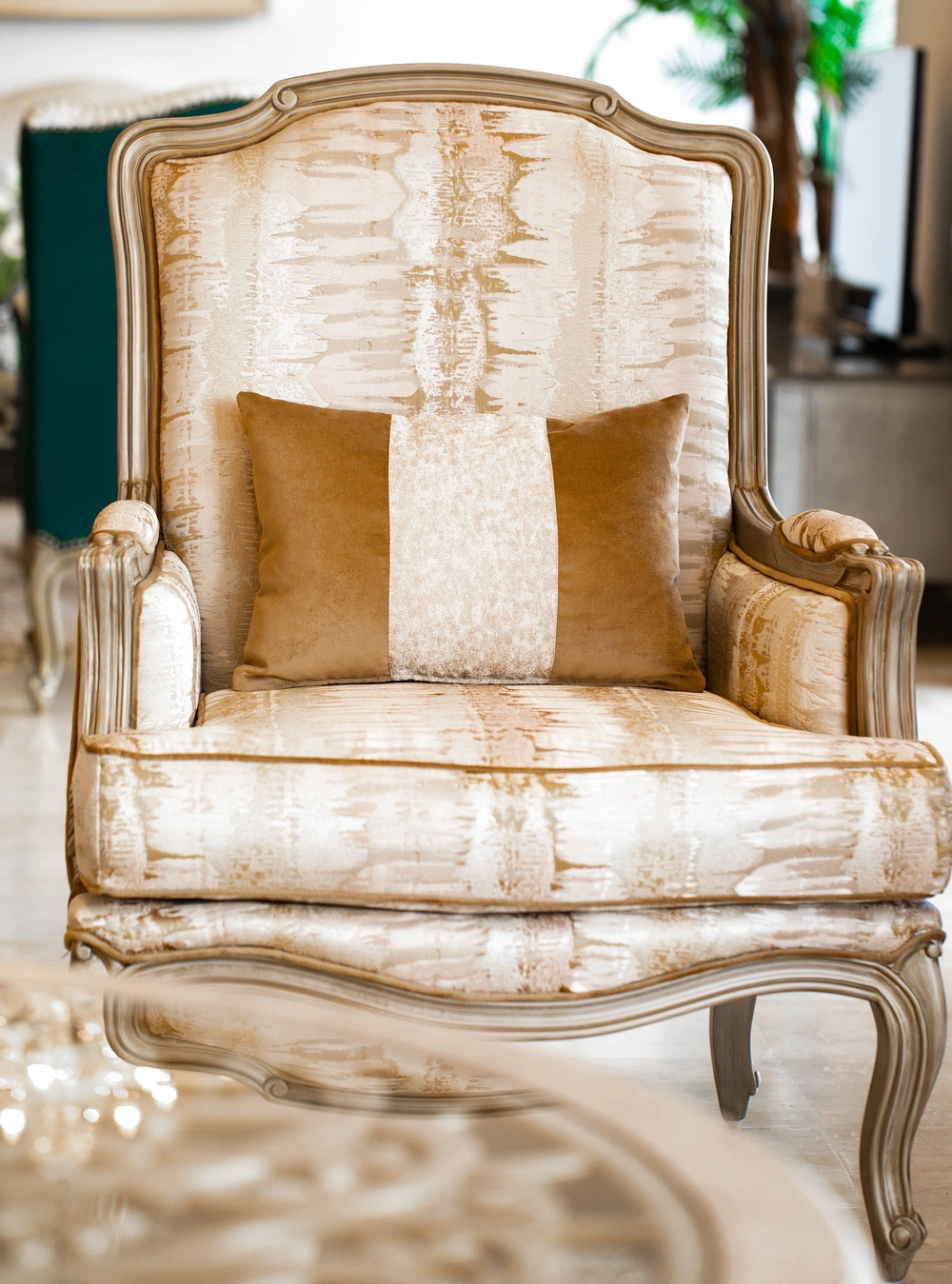 Fauteuil somptueux arbore un cadre en bois finement sculpté, notamment au niveau des accoudoirs et des pieds, illustrant un savoir-faire artisanal raffiné. Son revêtement…